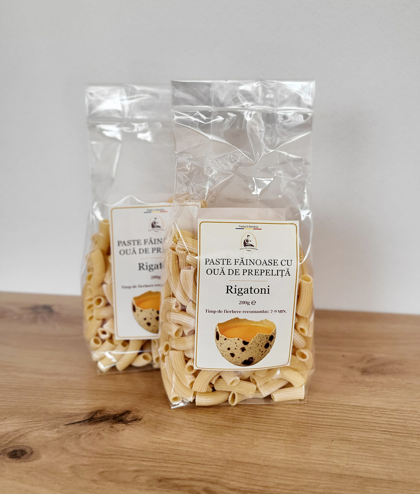Rigatoni cu ouă de prepeliță - paste făinoase din faină albă de grâu tip 550 și ouă proaspete de prepeliță. Rigatoni au forma unor tuburi cu lungimea de circa 3 cm și 8 mm în diametru. Procesul de uscare este lent, timp de 10-12 ore. Termenul de valabilitate este de 24 de luni de la data fabricării. Timp de fierbere estimat la 8-10 minute. Rigatoni se pot găti în diverse moduri, cu lapte, cu brânzeturi sau sosuri, chiar și în deserturi.