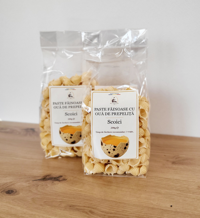 Scoici cu ouă de prepeliță - paste făinoase din faină albă de grâu tip 550 și ouă proaspete de prepeliță. Scoicile au forma unor ... scoici,  cu dimensiuni de circa 15 și 25 de mm. Procesul de uscare este lent, timp de 10-12 ore. Termenul de valabilitate este de 24 de luni de la data fabricării. Timp de fierbere estimat la 8-10 minute. Scoicile se pot găti în diverse moduri, cu lapte, cu brânzeturi sau sosuri, în deserturi.